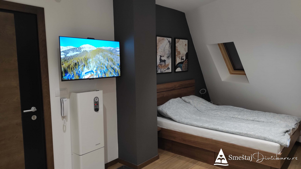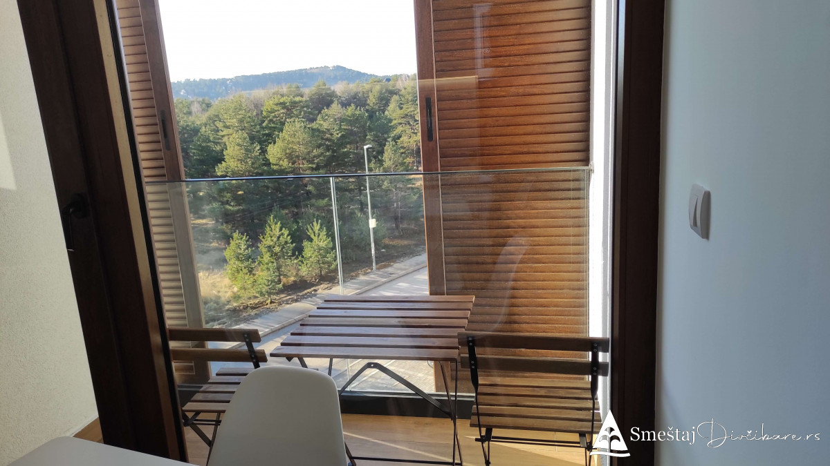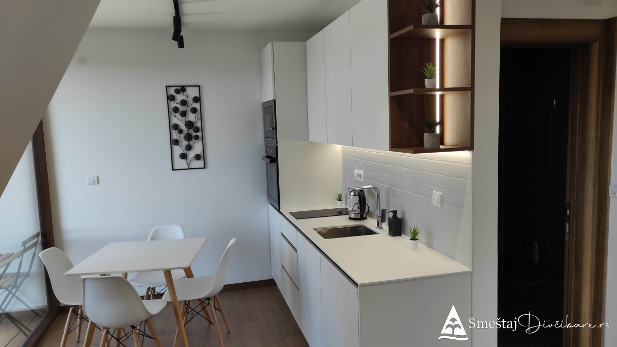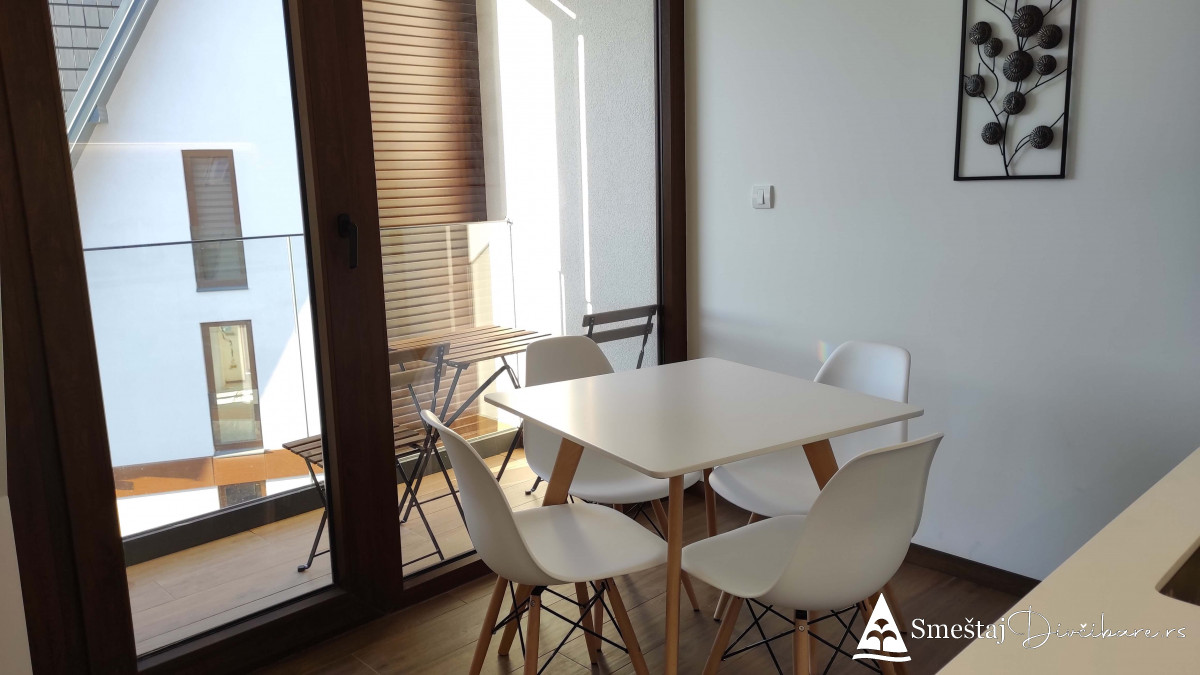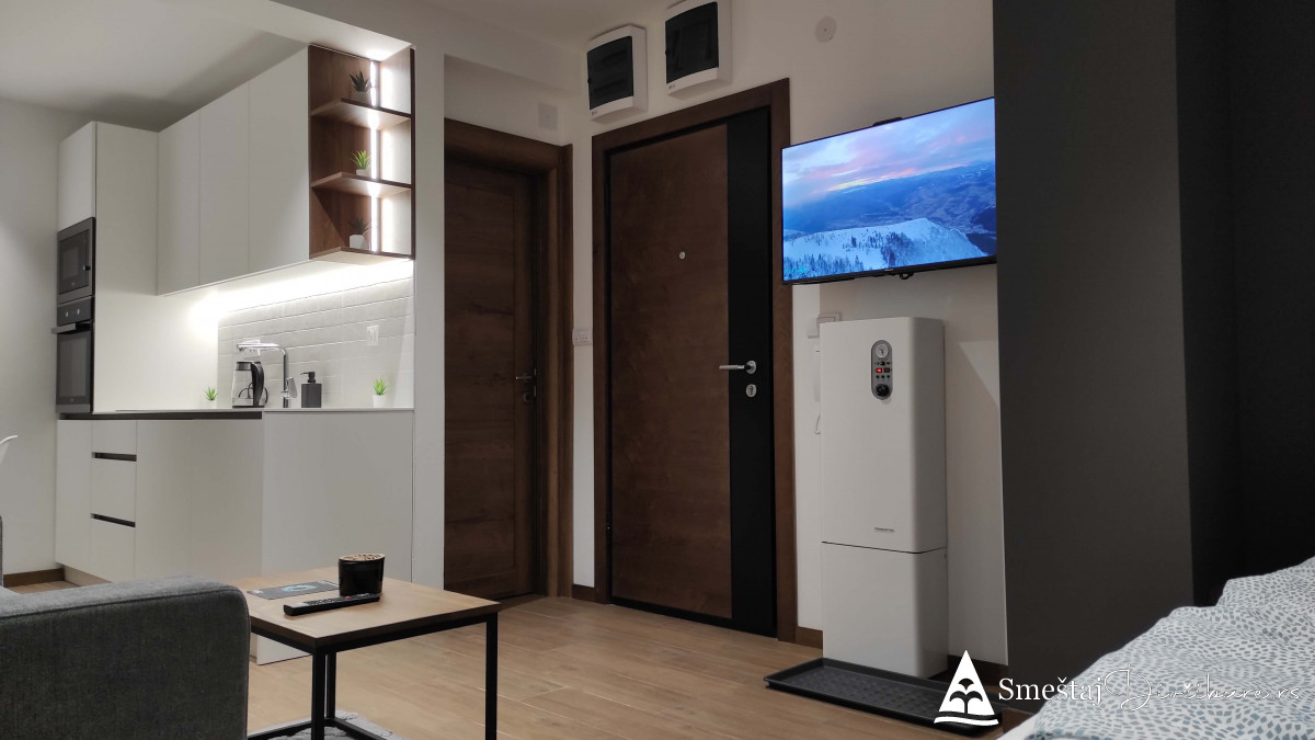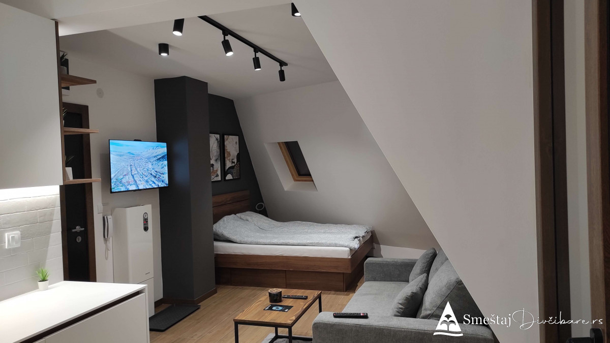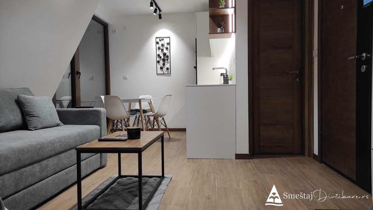 Apartman poseduje veliki bračni krevet sa dušekom vrhunskog kvaliteta na kome ćete moći de se savršeno odmorite i relaksirate, na središnjem delu apartmana se nalazi komforni trosed na kome možete uživati u kablovskoj televiziji, YouTube sadržaju, wifi internetu brzine do 150 mb/s ili bilo kojim dnevnim aktivnostima. Takođe trosed se prema potrebi rasklapa u ležaj 195x140cm tako da 4 osobe mogu komotno boraviti u apartmanu. U krajnjem desnom delu apartmana se nalazi moderna i potpuno opremnjena kuhinja sa svim posuđem, ugradnom rernom, mikrotalasnom, ravnom pločom i frižiderom. Naspram kuhinje se nalazi terasa sa stolom i stolicama za uživanje u kafi i čaju sa prelepim pogledom na planinu. Kupatilo sa tuš kabinom je izrazito prostrano i poseduje podno grejanje koje je takođe i u celom apartmanu namenjeno za maksimalan užitak prilikom boravka gostiju. Peškiri, fen i posteljina su takođe obezbeđeni.