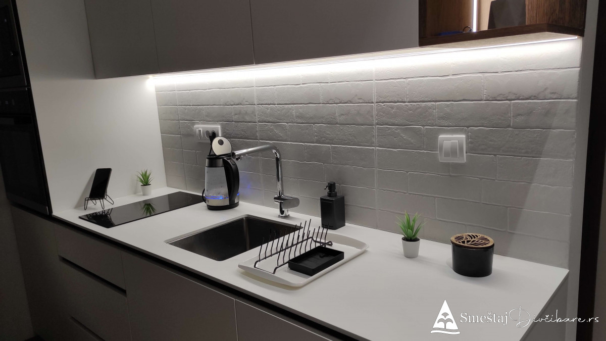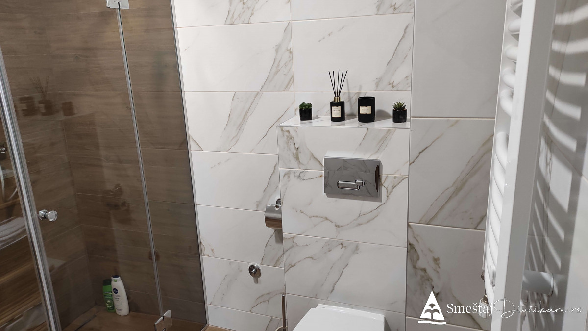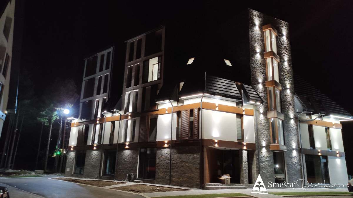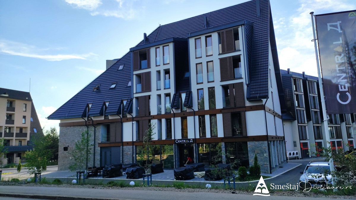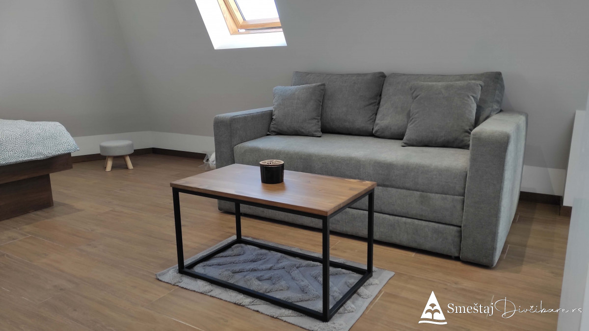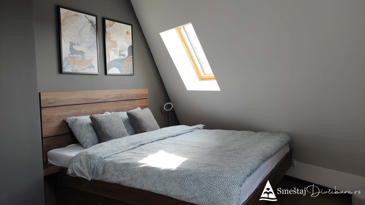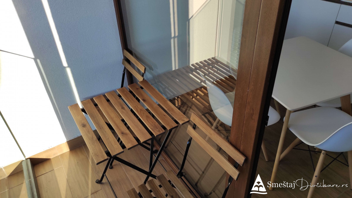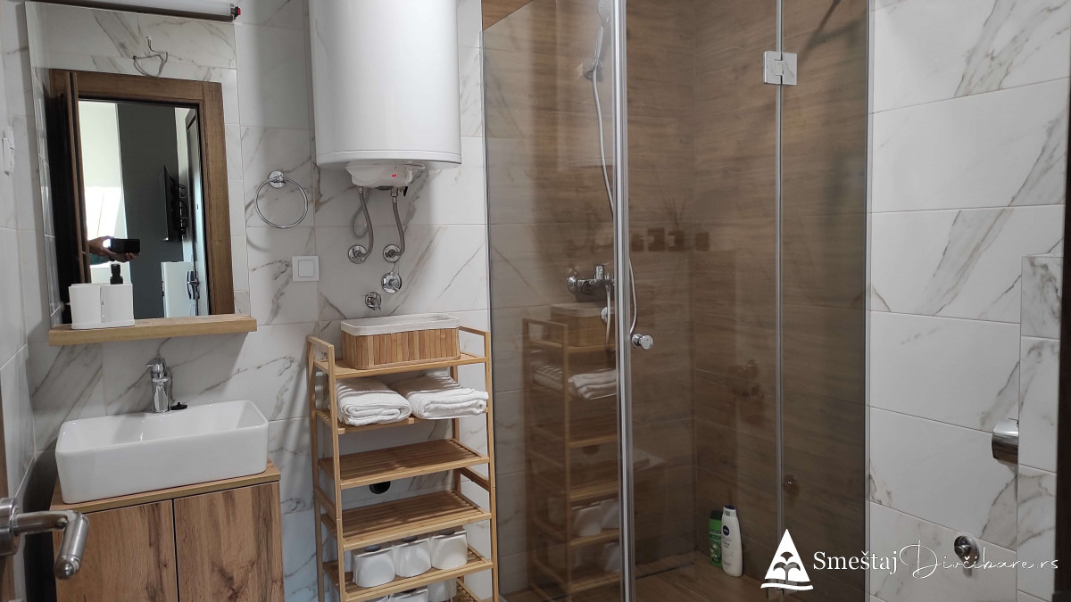 Apartman poseduje veliki bračni krevet sa dušekom vrhunskog kvaliteta na kome ćete moći de se savršeno odmorite i relaksirate, na središnjem delu apartmana se nalazi komforni trosed na kome možete uživati u kablovskoj televiziji, YouTube sadržaju, wifi internetu brzine do 150 mb/s ili bilo kojim dnevnim aktivnostima. Takođe trosed se prema potrebi rasklapa u ležaj 195x140cm tako da 4 osobe mogu komotno boraviti u apartmanu. U krajnjem desnom delu apartmana se nalazi moderna i potpuno opremnjena kuhinja sa svim posuđem, ugradnom rernom, mikrotalasnom, ravnom pločom i frižiderom. Naspram kuhinje se nalazi terasa sa stolom i stolicama za uživanje u kafi i čaju sa prelepim pogledom na planinu. Kupatilo sa tuš kabinom je izrazito prostrano i poseduje podno grejanje koje je takođe i u celom apartmanu namenjeno za maksimalan užitak prilikom boravka gostiju. Peškiri, fen i posteljina su takođe obezbeđeni.