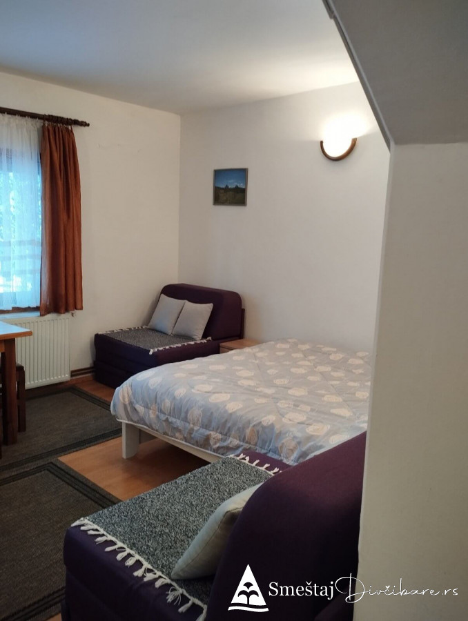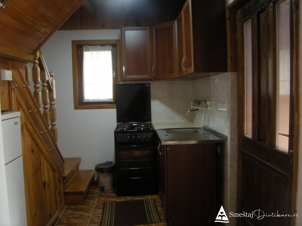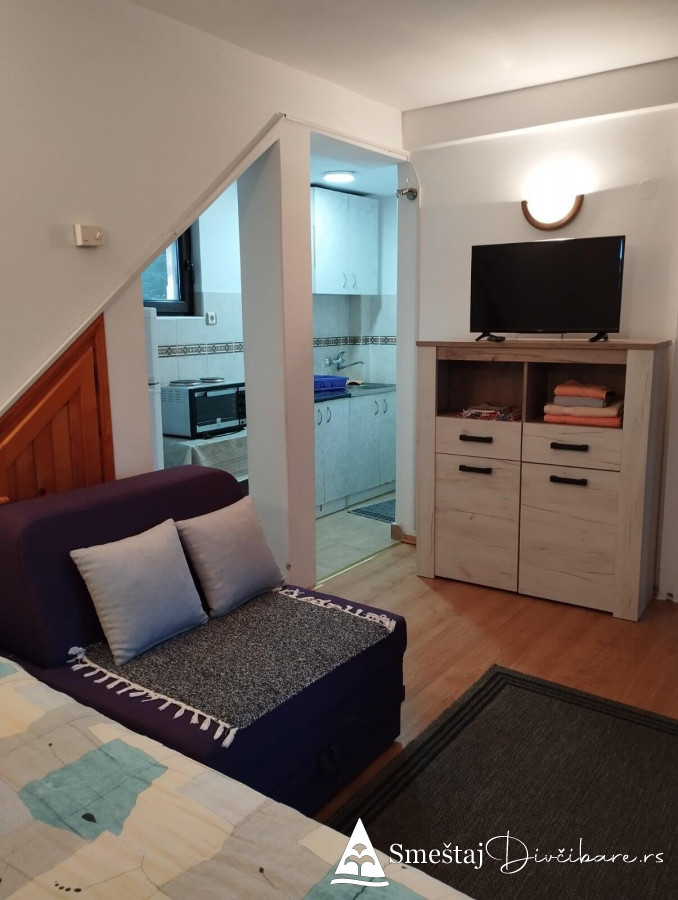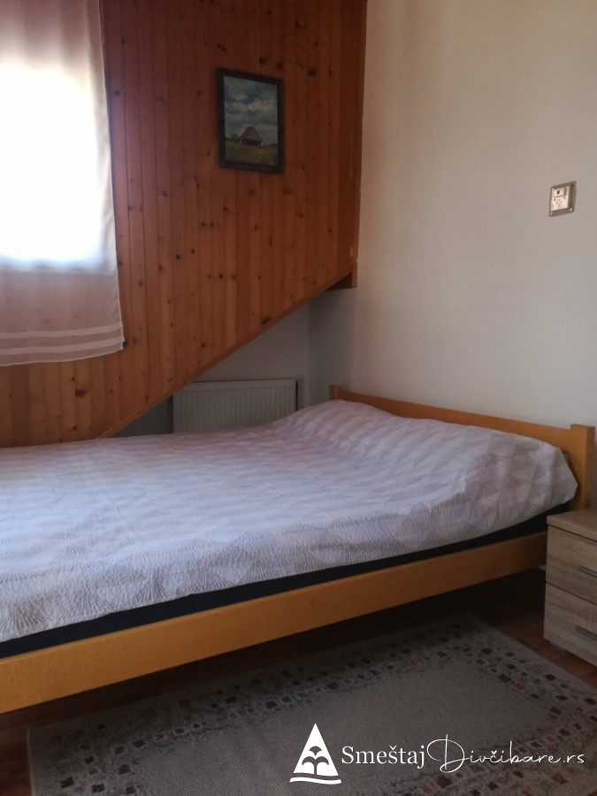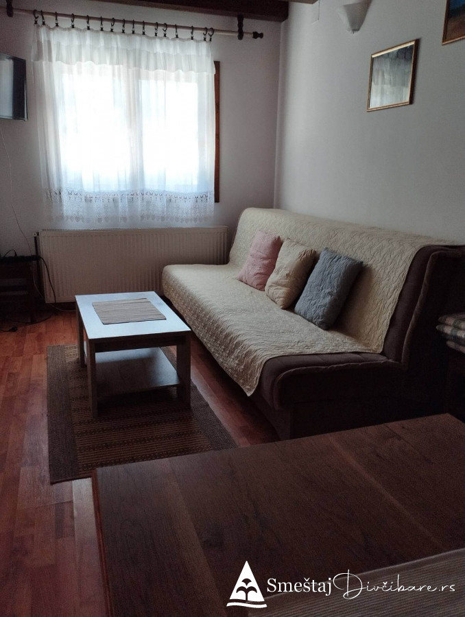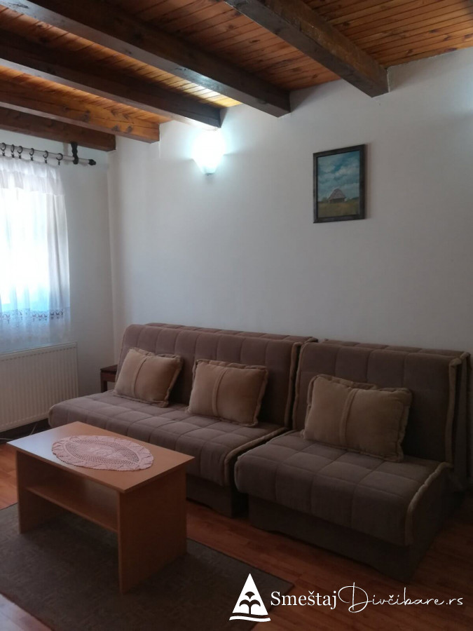 Veći apartman se sastoji od 2 trokrevetne sobe na spratu i dn. boravka sa kuhinjom i kupatilom u prizemlju.