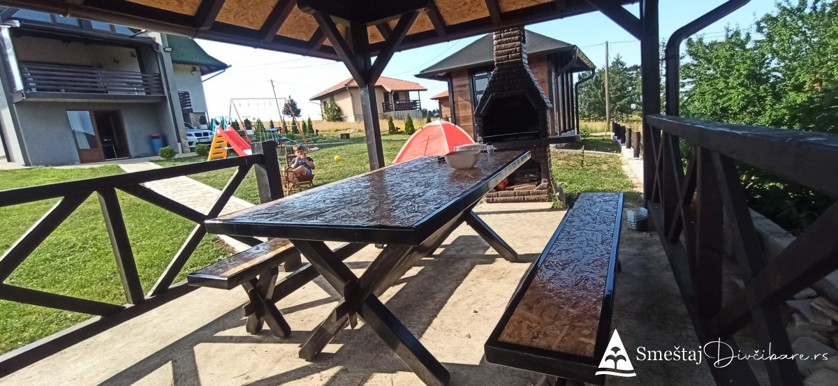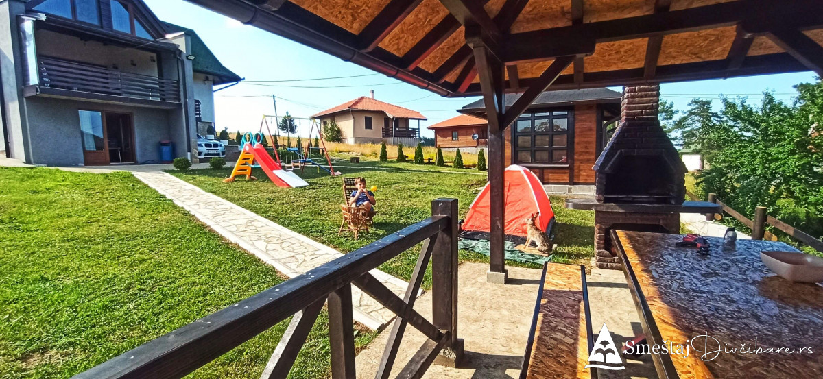 Dvorišni mobilijar, letnjikovac sa zidanim roštiljem, dečije igralište, ljuljaske, klackalice, penjalice, tobogan.